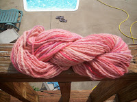 multi-colored coral stuff that was thrown in with an order of some sort of luxury stuff I ordered from my favorite place that I order from. :) I think it is probably merino, but not totally sure. It turned out okay. I'm not real thrilled with my spinning. I don't think I am progressing much. But I am fairly happy with the plying. This is only the second time I used the chain plying method aka Navajo plying.